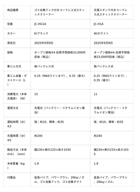 ゴミ収集ドック付きコードレス式スティッククリーナー(JC-HG1A)、充電スタンド付きコードレス式スティッククリーナー(JC-H1A)の概要は以下の通りです。
