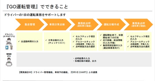 GOドライブ株式会社(本社:東京都港区、代表取締役社長:川上 裕幸)は、業務用車両における点呼・アルコールチェック・日報作成をスマートフォンアプリで簡単にできる新サービス『GO運転管理』を2025年8月26日(火)より開始します。当社が提供する次世代AIドラレコサービス『DRIVE CHART』の導入企業のうち一部事業者様においては、本サービスを今年3月より先行導入いただいております。大手物流企業やサービス業など幅広い業界の業務用車両管理現場で実際に活用されており、すでに11社合計15,000以上のユーザー(管理者・ドライバー)による活用を見込んでおります。