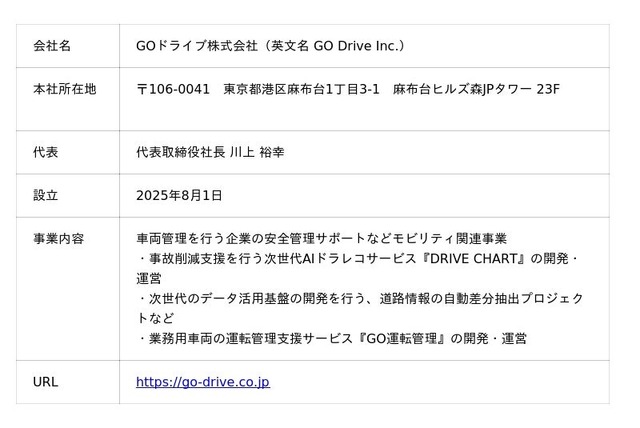 GOドライブ株式会社は、「運転」をより安全に、より便利に進化させることを目指し、車両管理を行う企業の安全管理サポートなどモビリティ関連事業を展開しています。テクノロジーの進化と使う人々の力を融合させ、より多くの交通課題を解決し、すべての人々が安心して暮らすことのできる社会の実現を目指します。