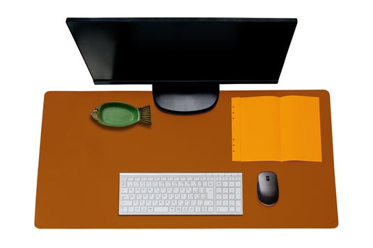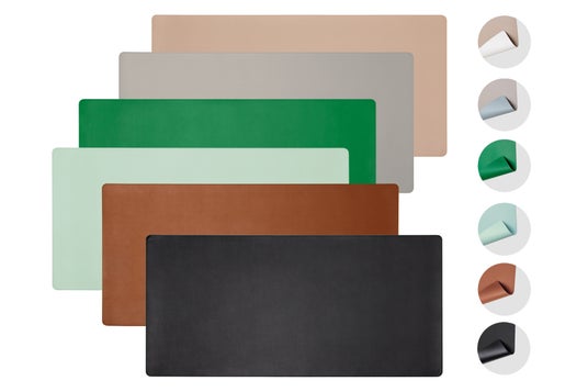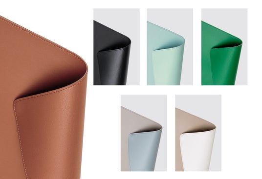 定番の落ち着いたブラックやブラウンなどの他、明るいカラーもラインアップ。インテリアや好みに合わせてお選びいただけます。また、ノートパソコンとマウスの作業にちょうど良いコンパクトな600×350mmと、モニターやメモ、ノートのスペースもとれる大きめサイズの900×430mmの2サイズを揃えています。
