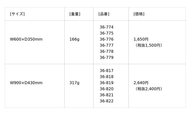 カラーバリエーションはオモテ/ウラ同色のブラック、ブラウン、ミント、グリーンと、オモテ/ウラの色が異なるグレー/ブルーグレー、ベージュ/ホワイトの計6色展開です。サイズとメーカー希望小売価格(税込)は、600×350mmサイズが1,650円、900×430mmサイズが2,640円です。