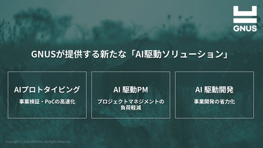 株式会社GNUS(読み:ヌース 本社:東京都港区、代表取締役CEO:文分 邦彦 以下GNUS)は、生成AIを活用して、デジタルプロダクト開発のプロトタイプから本開発・運用までを圧倒的に加速させるソリューションの提供を本格展開します。AI駆動ソリューションを通して、クライアントの新規事業やDXにおけるデジタルプロダクト活用や開発を支援します。