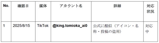 このたび、当社所属クリエイター「KING冨岡」を装った偽のTikTokアカウントの存在を確認いたしました。偽アカウントは、ユーザーネームを酷似させるほか、アイコン画像や動画を無断転用しており、あたかも本人・当社公式であるかのように装っていますが、当社およびKING冨岡とは一切関係ございません。