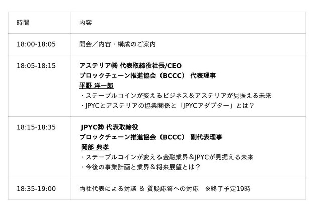 アステリア株式会社(本社:東京都渋谷区、代表取締役社長:平野洋一郎、証券コード:3853、以下アステリア)は、日本円建ステーブルコイン発行事業者JPYC株式会社の代表取締役、岡部典孝氏と、アステリア代表取締役社長の平野洋一郎が登壇する「ステーブルコインフォーラム」を、8月27日(水)18時から開催することを以下の通りご案内します。