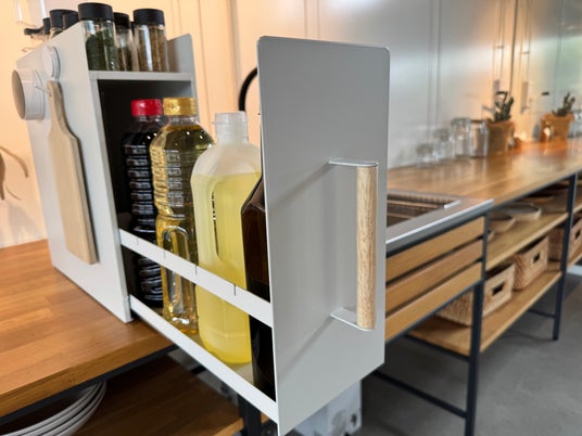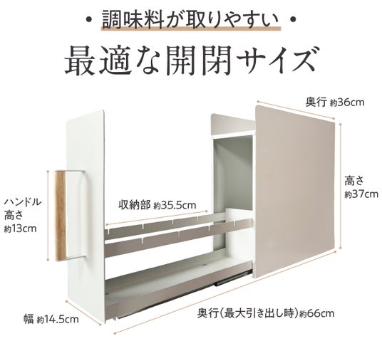そんな悩みを解決するのが本製品。幅14.5cmのスリム設計でコンロ横にぴったり収まり、調味料やスパイスを“隠して収納”できます。