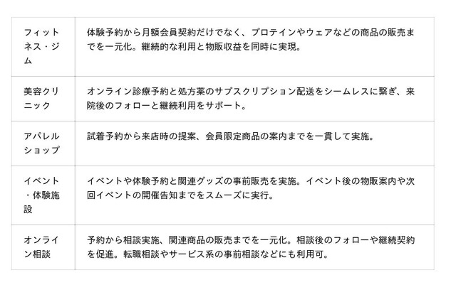 人口減少により限られた顧客をめぐる競争が激化している中、ジムやフィットネス、クリニック、各種スクールなど、多店舗・多拠点で運営するサービス業では、事業の多角化を図る動きが活発になっています。これまでEC事業者がオフラインへと進出する流れは多く見られましたが、他方でオフラインで多数の店舗を持つサービス事業者がECを含む物販などへ展開するケースが近年増加しており、この傾向はさらに加速していくことが見込まれています。今後、サービス事業者が事業成長していくためには、予約からのサービスの提供にとどまらず、来店・サービス提供後の商品購入の促進や月額メンバーシップ契約、回数券・チケット購買などのサブスクリプション化、CRM施策などをいかに仕組み化し、確立していくかが重要な要素となっています。