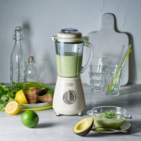 耐熱温度差120℃まで対応の耐熱ガラスジャーを採用し、氷を使ったスムージーから、熱湯を使用したポタージュまで幅広く活躍するブレンダーです。2段階のスピード切り替えやパルス機能付きで、食材やレシピに合わせて最適な調理が可能。ガラスジャーは傷がつきにくく、においや色移りも少ないうえ、食洗機対応でお手入れも簡単です。ふたのキャップは取りはずして大さじ1杯(約15mL)が量ることができるため、食材や調味料の追加にとても便利です。