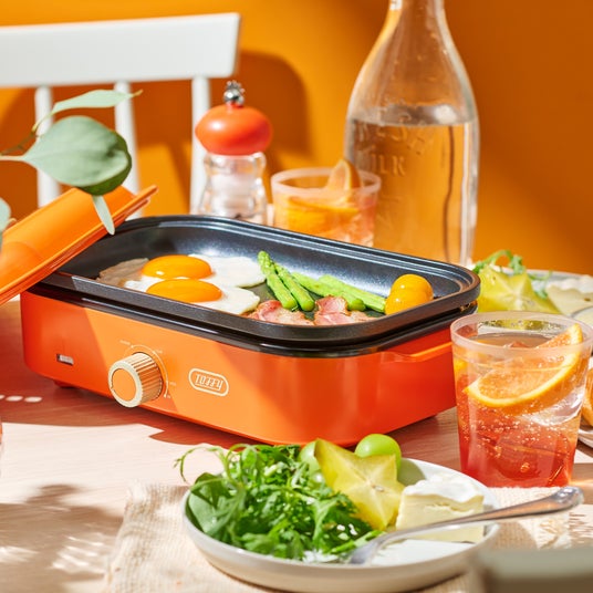 1~2人での使用に丁度良いサイズのホットプレート。火力は保温~200℃まで無段階で調節可能です。別売の「たこ焼きプレート」と「深鍋プレート」を使用することで、たこ焼きやお鍋も楽しむことができ、普段使いからホームパーティーまで幅広いシーンで活躍します。