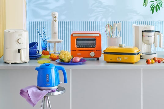 左から)Toffy エアフライヤー ミニ<1.2L> パンナホワイト 6,600円(税込)/ Toffy 給湯ロック付き電気ケトル フレンチブルー 5,500円(税込)/ Toffy ハンドブレンダー パンナホワイト 5,500円(税込)/ Toffy オーブントースター ミニ ヴァイブラントオレンジ 5,500円(税込)/ Toffy ホットプレート ミニ カナリアイエロー 5,500円(税込)/ Toffy Tea & Coffee メーカー パンナホワイト 5,500円(税込)