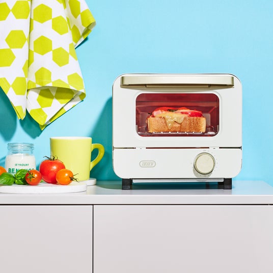 食パン1枚がすっきり入って、かさばらないミニサイズのかわいい卓上トースター。小型でもしっかり加熱できるので、ボリュームのある総菜などの温め直しもでき、付属のトレイを使用すれば、トースト以外のさまざまな料理にも活用できます。とびらを開けると焼き網が引き出されるので、取り出しにも便利です。