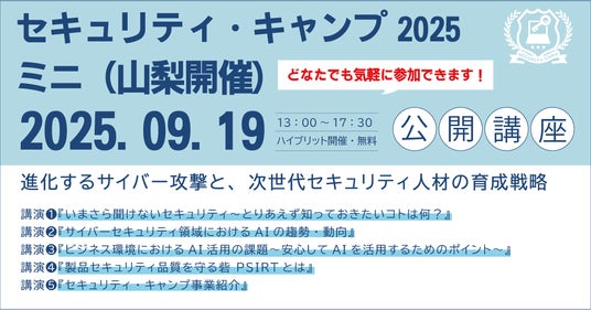 特定非営利活動法人山梨ICT&コンタクト支援センター、国立大学法人山梨大学、一般社団法人セキュリティ・キャンプ協議会が主催する「セキュリティ・キャンプ2025ミニ(山梨開催)」の公開講座を2025年9月19日(金)に開催いたします。