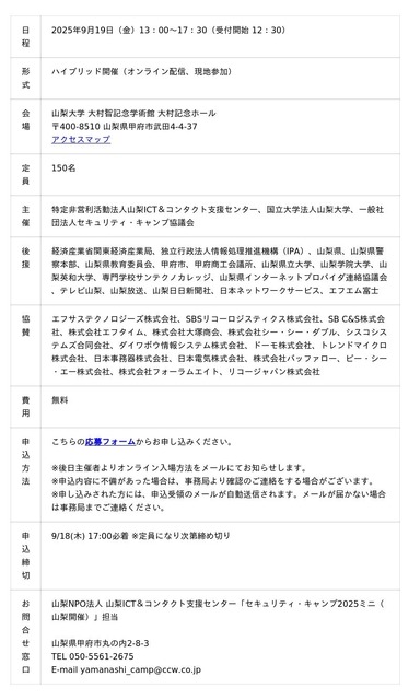 イベント詳細:https://www.security-camp.or.jp/minicamp/yamanashi2025.html