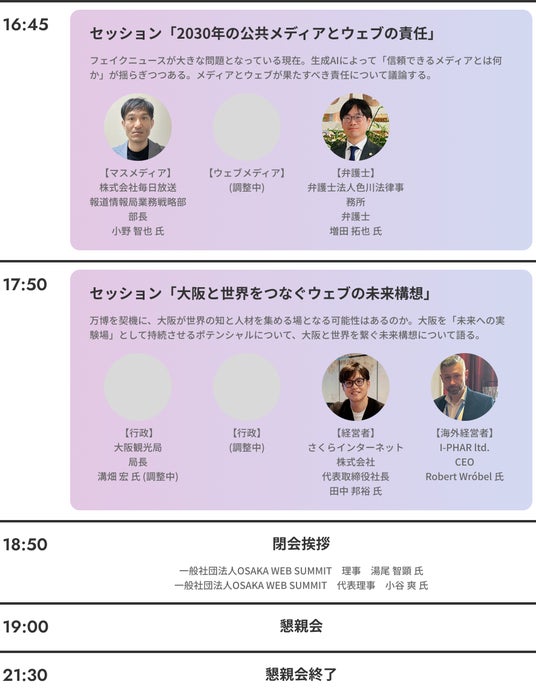 一般社団法人OSAKA WEB SUMMIT(所在地 : 大阪府大阪市北区、代表理事 : 小谷 爽)は、ウェブの未来とトレンドを大阪から世界に発信するイベント「OSAKA WEB SUMMIT」を2019年に立ち上げ、新たなビジネスチャンスやコラボレーションの機会創出に取り組んでまいりました。第6回目となる「OSAKA WEB SUMMIT #06」では、エコノス株式会社、株式会社Team if、弁護士法人フォーラム大阪法律事務所 協賛、大阪市、MBSテレビ、在日ポーランド商工会議所 後援のもと、2025年9月4日(木) Blooming Camp(グラングリーン大阪 北館 JAM BASE 3F さくらインターネット株式会社本社内)にて開催します。