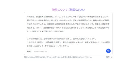 研究開発部門の研究者は、MyTokkyo.Aiに既存の設計メモや試作案を入力し、「既存特許との違い」「溶接レス構造の出願動向」などを照会した。