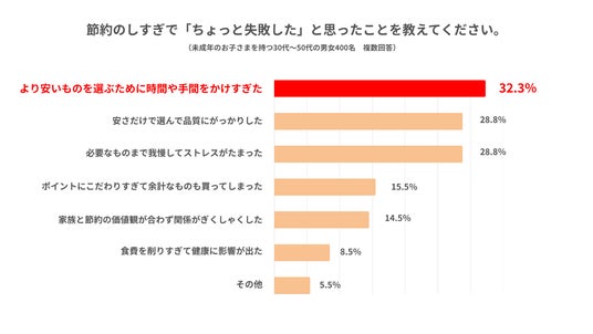 ・節約のし過ぎで「ちょっと失敗した」と思ったこと1位は「より安いものを選ぶために時間や手間をかけすぎた」に。安さや節約を重視するあまり、時間や品質や精神面を犠牲にすることで、節約がストレスになっている人が多いと推察される。