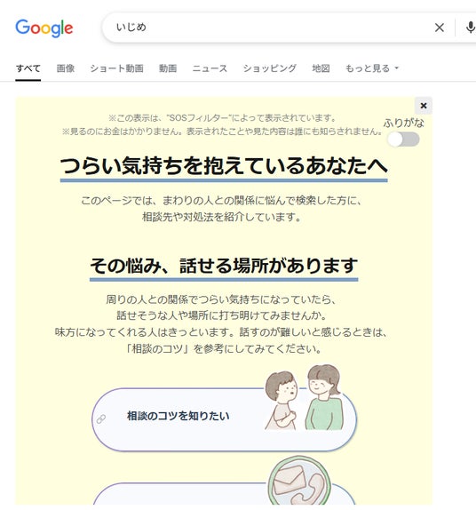 SOSフィルターとは、「GIGAスクール構想」に基づき、児童生徒に1人1台への配布が整備されている学習用端末(以下、1人1台端末)で深刻な悩みに関するワードを検索した際、相談窓口やセルフケアに関する情報をプッシュ型で届けられるブラウザ拡張機能です。