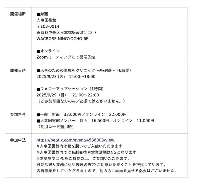株式会社Trustyyle(本社:東京都中央区・代表取締役:吉田洋介)は、運営するコミュニティ「人事図書館」主催にて、「人事のための生成AIクリニック~基礎編~」を開催いたします。本講座は、対面&オンラインでのハイブリッド開催となります。