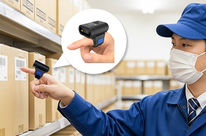 人差し指に装着してハンズフリーで作業できる、Bluetooth対応のリングスキャナ。軽量・コンパクトで、導入しやすい低価格と高速読み取りを実現。物流倉庫のピッキングや検品、小売の棚卸や品出し、製造現場での工程管理などを効率化します。