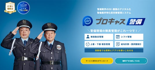 プロキャス警備は、ユーザー数を7万人突破し、継続率96.4%を誇る、労務管理システム「プロキャス」の警備業界特化型システムです。