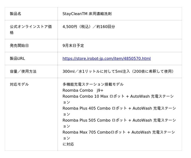 Roomba Max 705 Comboロボット + AutoWash 充電ステーションとセットで使えるStayCleanTM 床用濃縮洗剤も新たに発売されます。新製品の洗剤自動投入機能に対応しており、清掃用の水と自動的に混合されロボット本体に投入されます。水のみの拭き掃除よりも効果的に汚れを除去して床をキレイに保ちます。