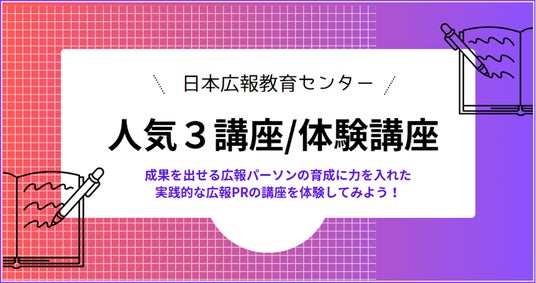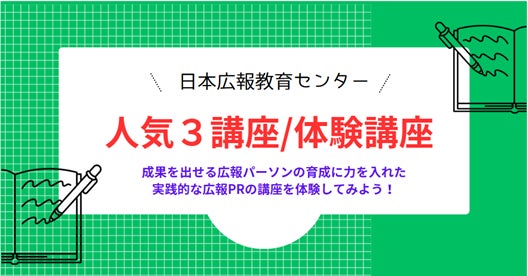この「人気3講座/体験講座」は、日本広報教育センターが誇る実践的な講座内容から厳選した部分を抜粋し、広報の現場で即戦力として活躍できるスキルを学ぶことができる講座です。