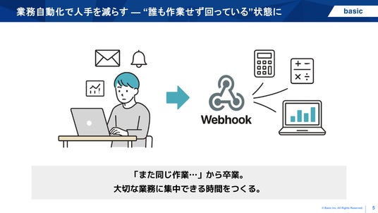 メール転送や情報転記といった人的作業を自動化。対応漏れ・入力ミス・属人化の防止にも効果的。 複数のツールをまたぐ対応もWebhookで繋ぐことで、現場負荷の大幅軽減と品質の均一化を実現。