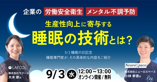 人的資本/ウェルビーイング経営支援の株式会社ラフール(本社:東京都中央区、代表取締役社長:結木啓太 以下「ラフール」)は、2025年9月3日(水)に 企業の労働安全衛生、メンタル不調予防、生産性向上に寄与する睡眠の技術とは?~9/3睡眠の日記念 睡眠専門家がその具体的な内容をご紹介~ をテーマとした共催セミナーを開催いたします。