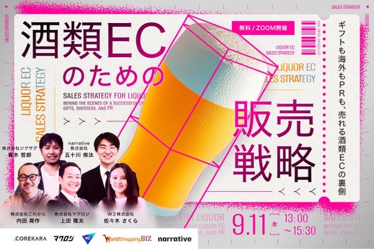 WorldShopping BIZを提供する株式会社ジグザグ(本社:東京都渋谷区、代表取締役:仲里一義)は、株式会社これから、株式会社マクロジ、W2株式会社、narrative株式会社をお招きし、「クラフトビール・日本酒…売れるECの共通点は?酒類ECのための販売戦略」をテーマとした無料オンラインセミナーを、2025年9月11日(木)に開催いたします。
