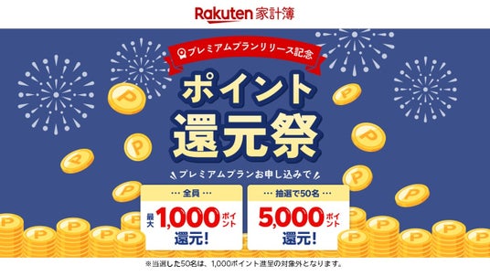 楽天グループ株式会社が提供する家計管理アプリ「楽天家計簿」は、プレミアムプランの開始を記念して「【楽天家計簿】プレミアムプランリリース記念!ポイント還元祭!」を本日開始しました。