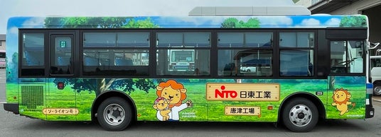 ラッピングバス「ソーライオン号」は、日東工業のイメージキャラクターである「ソーライオンファミリー」が自然の中を楽しく散策するイメージを全面にデザインしたもので、「まもりたい。美しい地球も みんなの暮らしも」のキャッチコピーで日東工業の想いを伝えています。