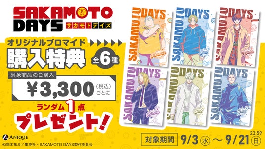 Anique株式会社(本社:東京都千代田区、代表取締役:笠井高秀)は、同社が運営するサービス「Aniqueショップ」にて、TVアニメ『SAKAMOTO DAYS』新規オリジナルグッズを予約販売いたします。
