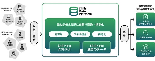 『スキルデータプラットフォーム』は、各事業部や拠点ごとで管理しているスキルマネジメントシステム上のスキルデータ、人事システム内にある従業員情報、外部の求人情報などを収集・蓄積し、生成AIによって誰もが使えるスキルデータに変換します。さらに、「人材サーチAI」機能などによって、組織横断による特定スキルや経験を持つ人材の検索が可能になります。現場のスキル情報を全社レベルで共通の言語として統一することで、経営や人事がデータに基づいた根拠のある戦略人事を実現できるよう支援します。