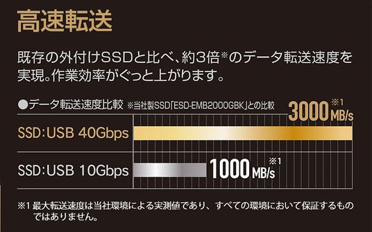 - 既存の外付けSSD(当社ESD-EMB2000GBK)と比べて、約3倍のデータ転送速度を実現。大容量の動画ファイルや高画質の画像データなどもスムーズに扱えるため、作業効率がぐっと上がります。