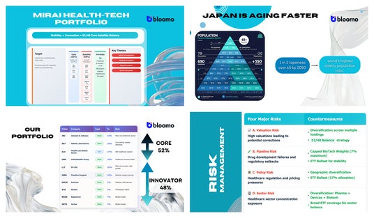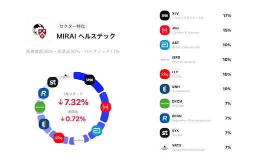 ヘルスケアセクターの中で、配当率の高い安定銘柄や分散型のETFを約半分、残りの半分を成長性の高いヘルステック銘柄に割り当て、成長と安定のバランスをとっています。