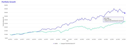過去データをベースにして、2015年12月末から2025年7月末までのポートフォリオ運用成績をブルーモ証券にてバックテストしています(Portfolio Visualizerのシミュレーションで実行)。