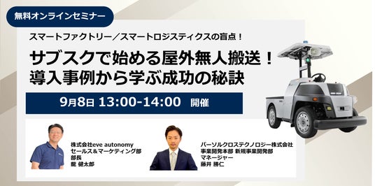 株式会社eve autonomy(イヴ・オートノミー、静岡県磐田市、代表取締役CEO:星野 亮介、以下「eve autonomy」)は、パーソルクロステクノロジー株式会社と共催で、2025年9月8日(月)に無料オンラインセミナー「スマートファクトリー・スマートロジスティクスの盲点/サブスクで始める屋外無人搬送!導入事例から学ぶ成功の秘訣」を開催いたします。