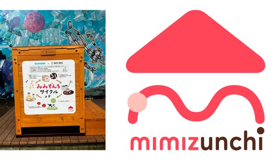 ミミズの入ったコンポスト※1「mimizunchi(ミミズンチ)」(左)とロゴマーク(右)