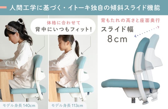 人間工学(エルゴノミクス)に基づいたイトーキ独自設計の「背奥行傾斜スライド調節機能」(最大8cm)により、背もたれの高さと奥行きをワンアクションで同時に調節可能。成長や体格に合わせてフィット感を高め、正しい姿勢を自然にサポートします。