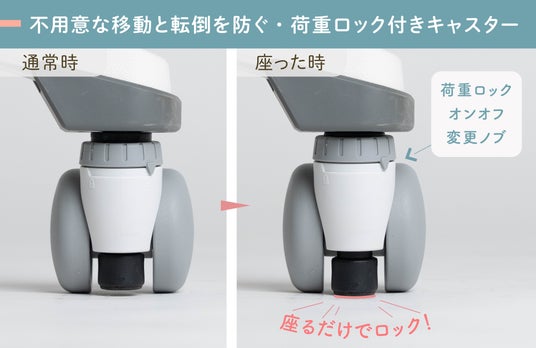 着座時に自動でキャスターがロックし、不要な移動や転倒リスクを軽減