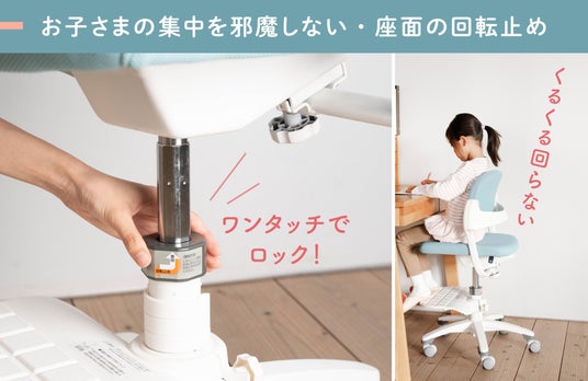 座面がくるくる回って遊んでしまう場合でも、支柱のロックレバーでワンタッチ切り替えが可能。学習時の姿勢を安定させ、集中をサポートします。