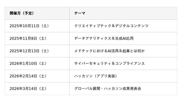 - 毎回テーマが変わる学びの場生成AI、データ分析、サイバーセキュリティ、クリエイティブテックなど、多様なテーマを設定。自分の興味や進路に合わせて参加できます。- 実践を重視したプログラム講師の一方的な講義ではなく、トークセッションやワークショップ形式で「自分で手を動かしながら学ぶ」体験を重視。