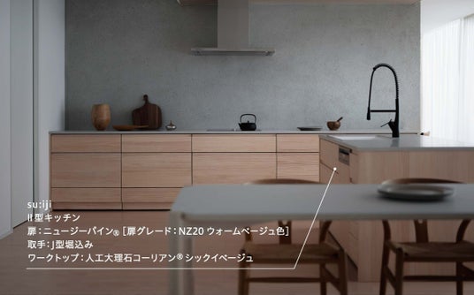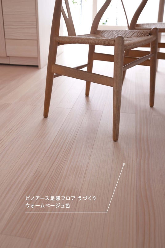 新色の「ウォームベージュ色」は、建具だけでなく、床、階段、キッチンなどのカラーラインナップにも追加されました。ニュージーパイン(R)の床材は、熱を伝えにくい性質を持つため、夏はさらりと、冬はほんのり暖かく、一年中快適に過ごせます。