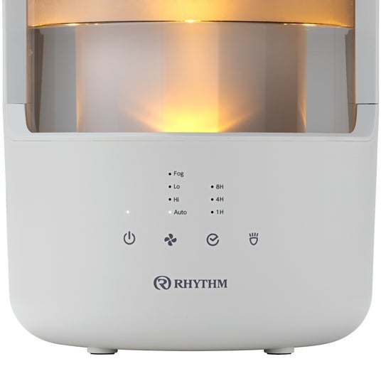 電源を入れると暖色のあたたかなあかりと共に加湿が始まる際、雲海のような霧がタンク内にたまり、霧が高く放出し加湿するリズム独自(特許取得済)のくつろぎの時間を演出します。