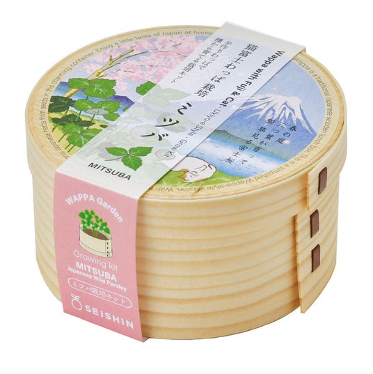 春の富士と猫ののどかな風景を描いた、曲げわっぱで三つ葉を育てる。日本製の曲げわっぱに、満開の桜、青い富士山、のんびり寝転ぶ猫、そして育った三つ葉がそよぐ原っぱを浮世絵風に描いた、春の情景あふれるデザイン、添えられた一句が、やさしい季節のひとときを詠みあげます。