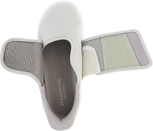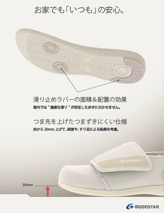 柔らかい素材で足当たりもやさしく、スッと履ける踵形状で脱ぎ履きも簡単。介助する方も楽に履かせることができます。むくみが気になる方でも着脱しやすいように「PASTEL410」は履き口が大きく開き、「PASTEL411」は幅広の甲バンドがゴムなのでよく伸び足にフィットする仕様が特徴です。靴底の滑り止めラバーは室内での利用を考慮した面積と配置に設計され、安定した歩行をサポートします。つま先部分は床から20mm上げており段差やすり足によるつまずき防止の設計。中敷を外してウィズ調整も可能です。さらに軽量性やニュートラルな落ち着いたカラー展開で室内での快適さにもこだわりました。リハビリシーンやお庭やちょっとした外履きにもおすすめです。