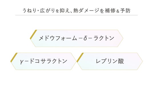 さらに、熱に反応して髪を補修するヒートリペア成分として、メドウフォーム-δ-ラクトン*¹³とγ-ドコサラクトン*¹³の2種類の保湿成分も配合しており、ドライヤーやヘアアイロンの使用でさらにケア効果を高め、日々の“熱”によるダメージから髪を守りながら、潤いのある髪へと導きます。