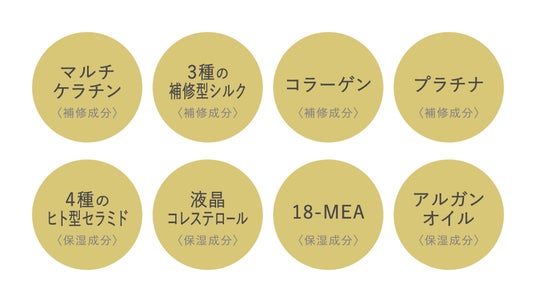 また、4種のヒト型セラミド*⁸、液晶コレステロール*⁹、18-MEA*¹⁰など、美髪を保つのに必要不可欠なCMC成分をたっぷりと配合。ダメージにより髪内部から不足してしまったCMC成分をふんだんに補給することで髪内部のラメラ構造が整い、髪のうるおいと柔軟性を高めて内側からハリやツヤを感じる扱いやすい美髪をキープします。さらにアルガンオイル*¹¹が髪表面 に密着し、うるおいを閉じ込めて外部刺激から髪を保護。内外Wのアプローチにより、ハイダメージ髪も芯からなめらかでまとまりのある美しいツヤ髪へと導きます。