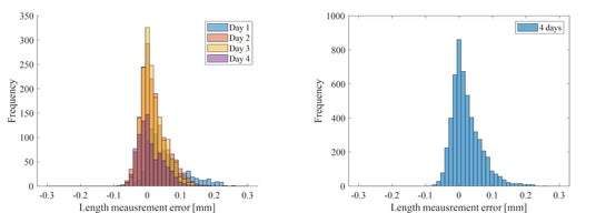下記は、1,200万画素カメラ3台を使用し、CMM(座標測定器)の移動量を正としたときの二点間距離の検証結果を元にしたヒストグラムになります。検証は、3次元測定機の制度保証方法を参考に、様々な方向の二点間距離の計測を4日間に渡り行いました。左図が日ごとの結果、右図が4日間の合計を表したヒストグラムです。
