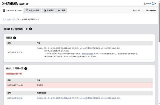 『NWR100』は、ネットワークトラブルの可視化と対処支援を行う新機能「ウェルネスモニター」を搭載しています。ネットワークトラブルの多くは、インターネット回線の障害、電波干渉、特定の無線モジュールへの接続集中など、複数の要因が絡みます。特に無線LAN環境では要因の切り分けが難しく、復旧まで時間を要する傾向です。