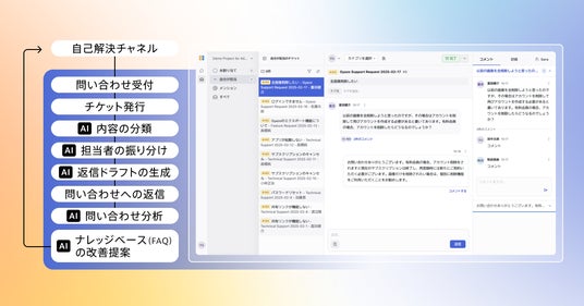 「Helpfeel Support」は、この領域を有人対応のカスタマーサポート業務まで拡張し、AIを通じて一気通貫に支援します。問い合わせ(※1)が入るとチケット化し、AIのSara(※2)が自動で内容の分類、担当者の振り分け、返信ドラフトの生成までを実行します。オペレーターはAIが用意した内容を確認・送信するだけで初期対応を完了できます。さらに、対応履歴からナレッジベース(FAQ)の改善点を抽出し、自己解決を促すコンテンツ作成まで支援することで、問い合わせ件数そのものを減らすという好循環を生み出します。